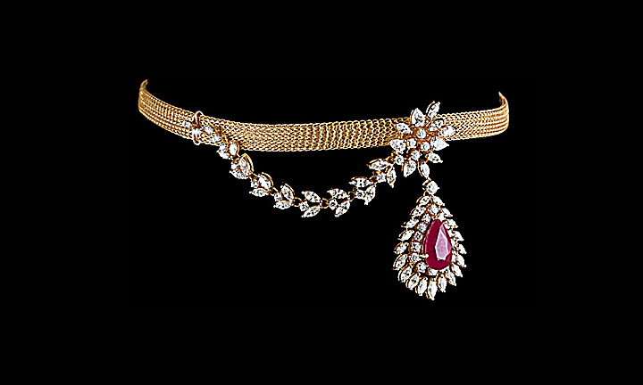 Sleek necklace design studded with real diamonds and semi precious red stone.