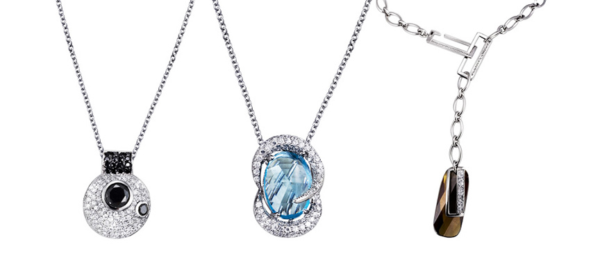 Contemporary design of pendants studded in beautiful round diamonds and unique semi-precious stones.