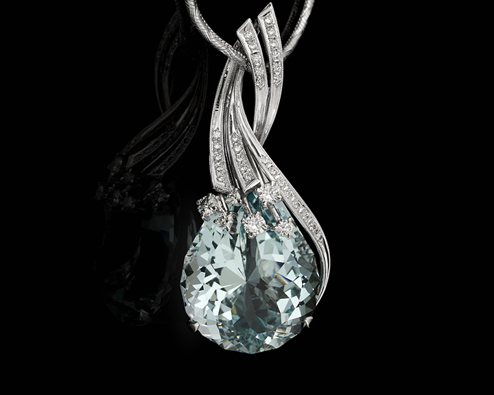 Elegant aqua blue stone in an exclusively handcrafted ring of beautiful white diamonds.
