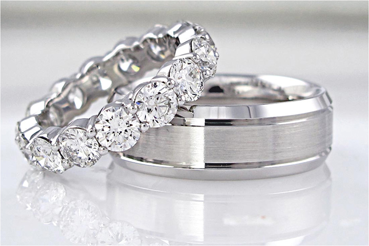 A set of band in small diamonds and ring with centre solitaire supported by handcraft